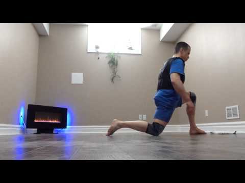 Working on the front split, using a 20 lb weight vest. Almost there!